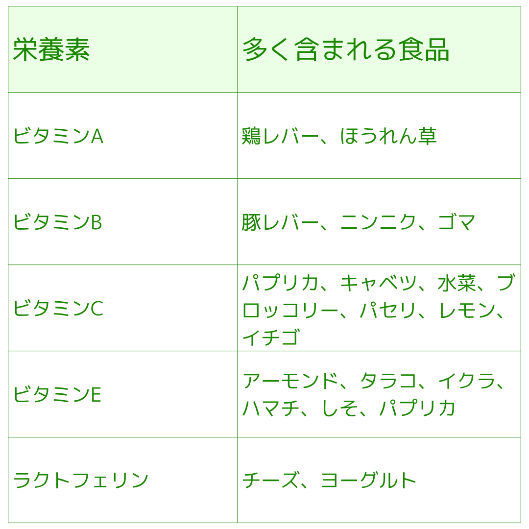 表にあるように、ビタミン類やラクトフェリンは多くの食物に含まれています。これらを上手に料理して食べれば、ニキビができにくい健康的な体へと変わっていくでしょう。